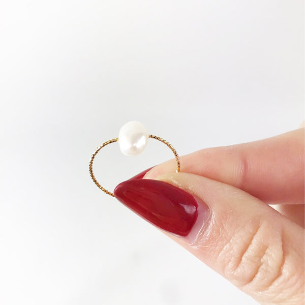 本体のシンプルな1mm極細リングにちょこんとベビーパールが乗っかったキュートなリングとなっております。 一点一点手作りで製作致します。